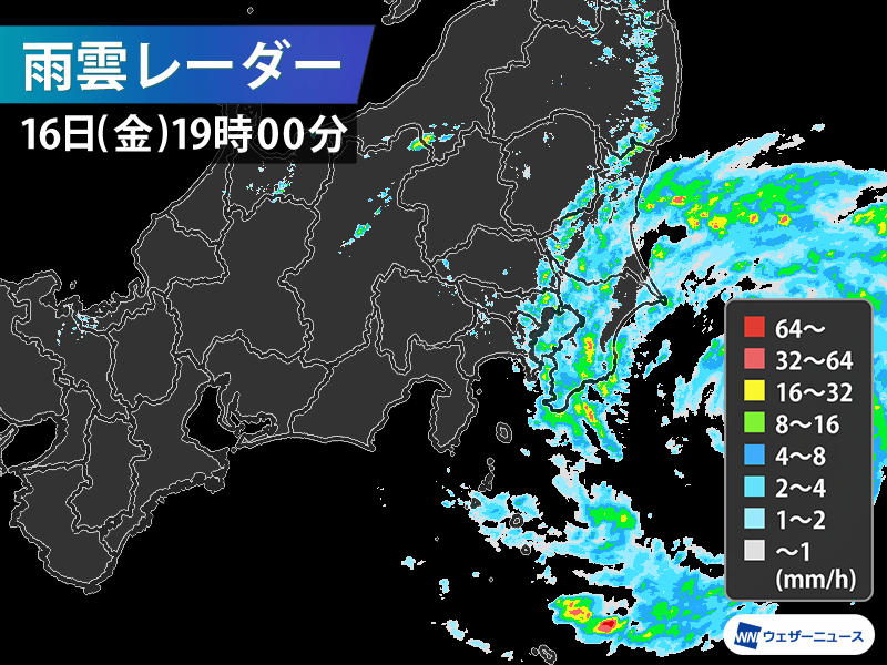 このアウターバンドの雨雲が関東にもかかり、千葉県坂畑では16時50分までの1時間に33.0mmの強い雨を観測しました。
