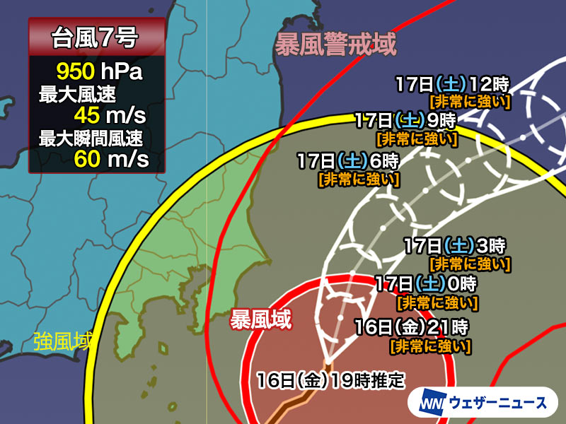このため、台風が陸地に近づいても衰えず、関東のすぐ東側を通る際も中心付近の最大風速は45m/sと非常に強い勢力で、今日の夜にかけて最も接近する予想です。