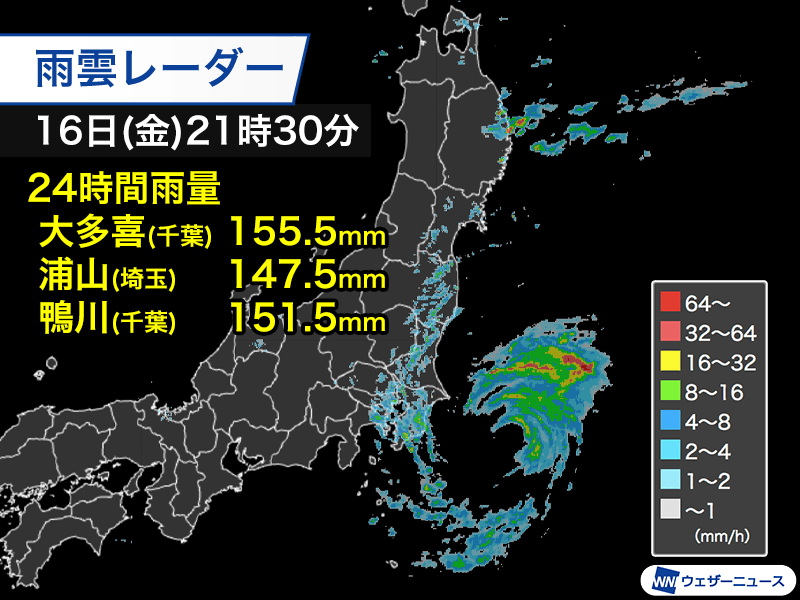台風の中心は陸地から離れているものの、スパイラルバンドと呼ばれる台風を取り巻く活発な雲の帯が断続的に通過し、雨の強まっている所があります。千葉県の房総半島では多い所で24時間雨量が150mm前後に達し、この後も強雨の可能性があることから土砂災害などに警戒が必要です。