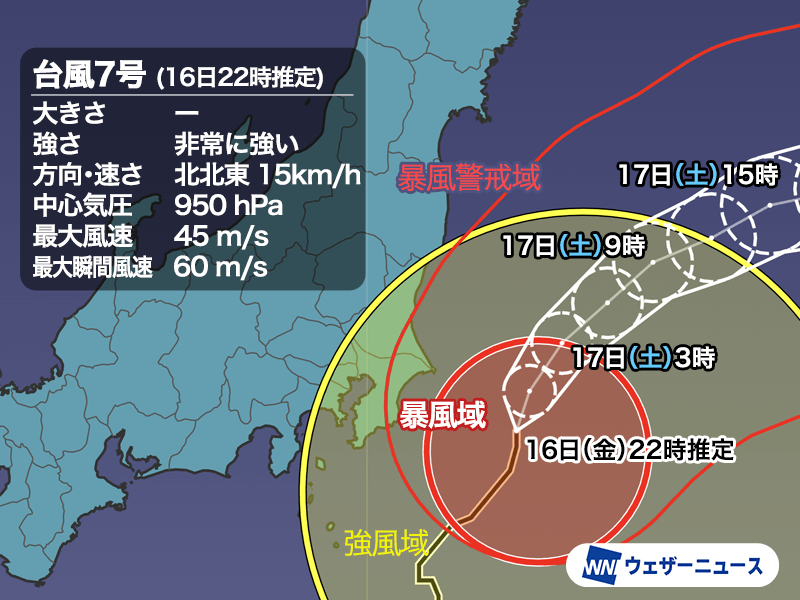 台風7号は予想された中でも比較的東寄りの進路を進んでいます。非常に強い勢力を保っているものの、中心に近い所で風が強まる傾向がみられ、最大瞬間風速は21時30分の時点で千葉県銚子市で24.2m/s、成田市で23.1m/s、横浜市で21.1m/sです。