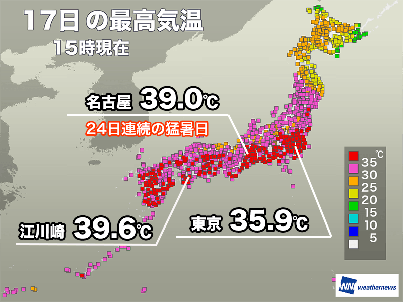 最も高い最高気温は高知県江川崎の39.6℃。名古屋は39.0℃を観測して24日連続の猛暑日となりました。