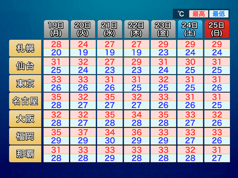 週の中頃までは日差しが届くと猛暑日になり、西日本は最低気温もかなり高めで福岡市は29〜30℃の予想となっています。23日(金)以降の次の週末は、暑さが落ち着いて35℃以上の猛暑日の所が少なくなる見込みです。最低気温も低下傾向で、だいぶしのぎやすくなります。