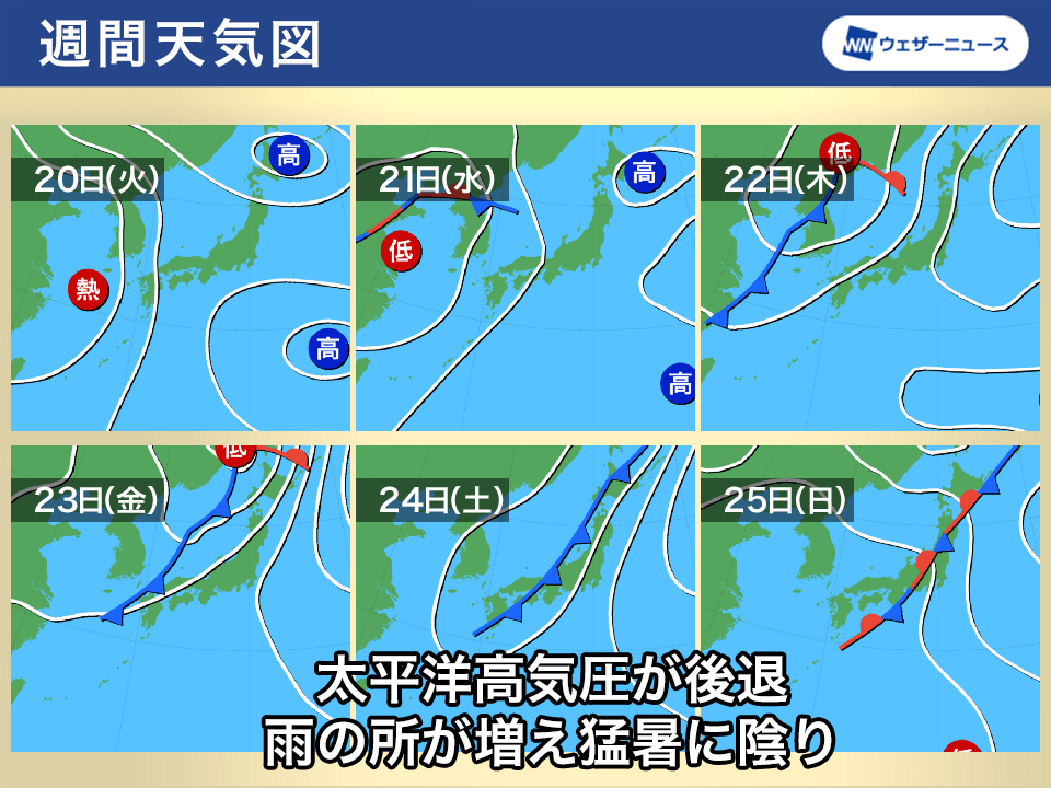 太平洋高気圧が後退する週後半は、天気が崩れることもあり、7月後半から続いているような猛烈な暑さは解消する見通しです。