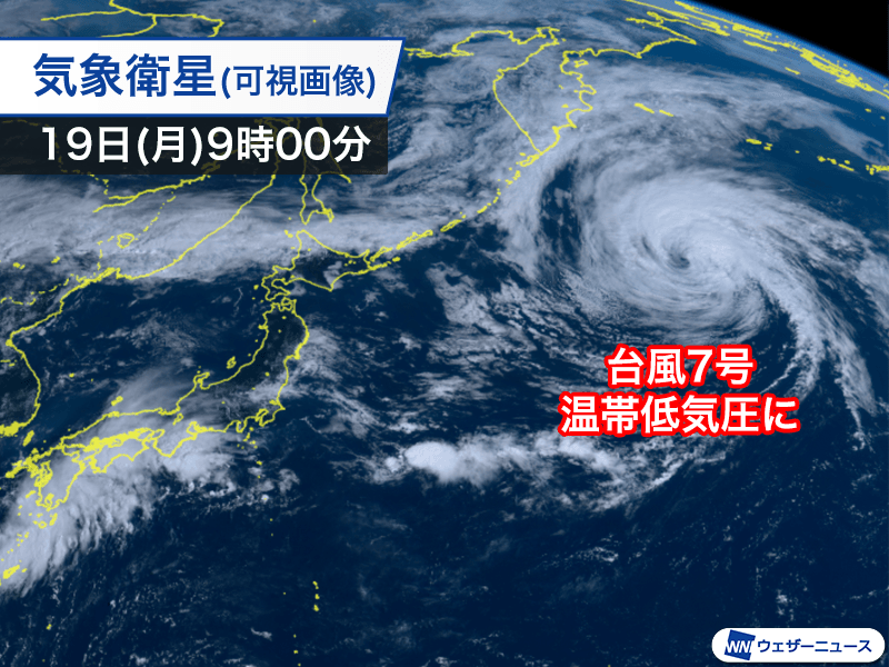 まだ、台風を思わせるしっかりとした雲の渦を形成しているものの、海面水温が22〜23℃まで低下していることもあり、19日(月)9時の時点で温帯低気圧と解析されています。