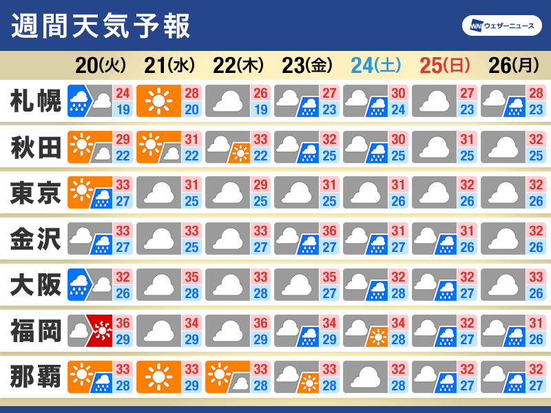 むしろ、北日本は暖かな空気の影響を受けやすく、秋田市では明後日から週末にかけて30℃以上の真夏日で、22日(木)は33℃まで上がる見込みです。明日は少し気温が下がる札幌市も30℃前後の日があり、一気に秋到来とはいきません。