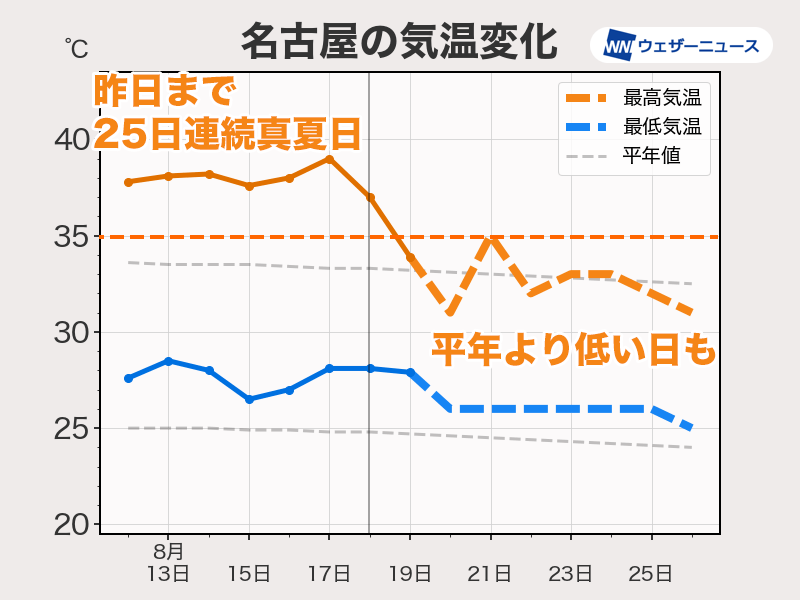 猛暑日連続記録が25日でストップした名古屋市は、週末にかけて猛暑日を予想しているのが明後日21日(水)だけです。週後半は平年並みか少し低い日もあるとみられます。記録的猛暑が終わりを迎え、本来のこの時期らしい暑さになる見通しです。