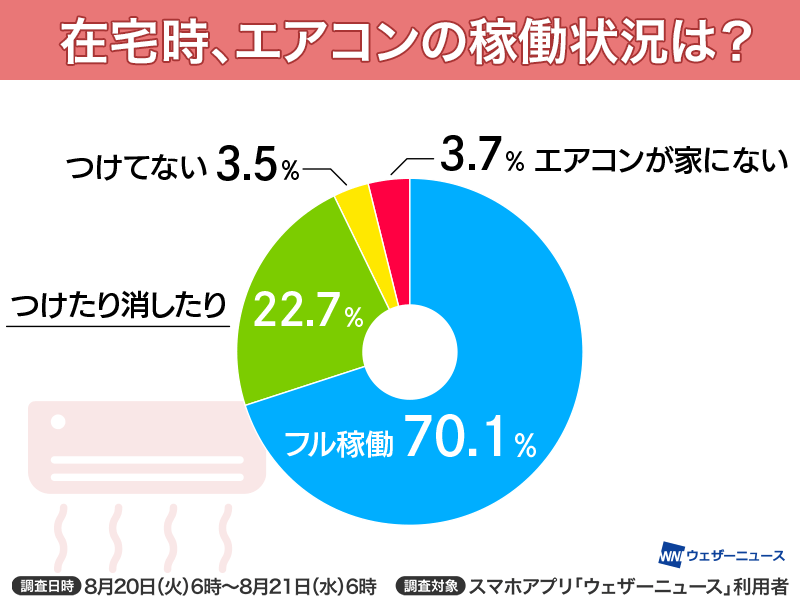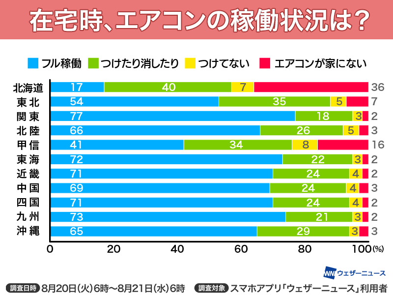 調査日:2024年8月20日6時〜21日6時質問1:在宅時、エアコンの稼働状況は?