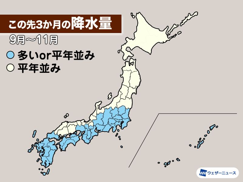 太平洋高気圧の縁をまわって暖かく湿った空気が流れ込むため、沖縄や西日本、東日本の太平洋側は雨の日が多くなる見通しです。3か月の降水量は平年並みか平年より多い予想となっています。