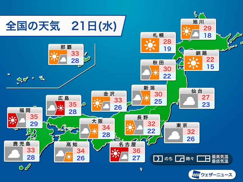 明日21日(水)は夏の高気圧が勢力を強めて、西日本から東海にかけての広い範囲を覆います。近畿や東海は今日よりもしっかりと日差しが届く分だけ気温が上がる見込みです。