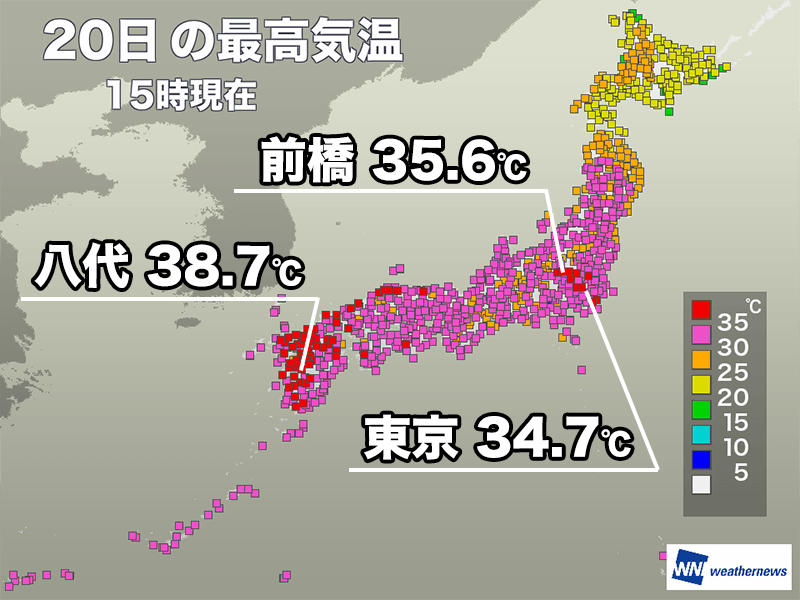 15時00分までの最高気温が全国で最も高かったのは熊本県八代市で38.7℃、次いで大分県日田市が38.3℃、福岡県宗像市で38.2℃と、上位は軒並み九州です。福岡県太宰府市でも37.6℃まで上がって、連続猛暑日の記録は33日に伸びました。