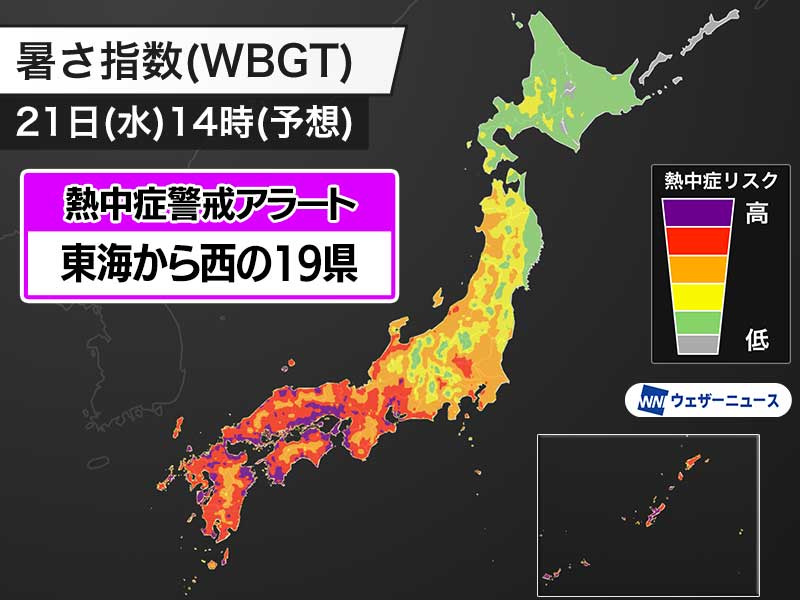 明日8月21日(水)対象の熱中症警戒アラート 東海から西の19県に発表