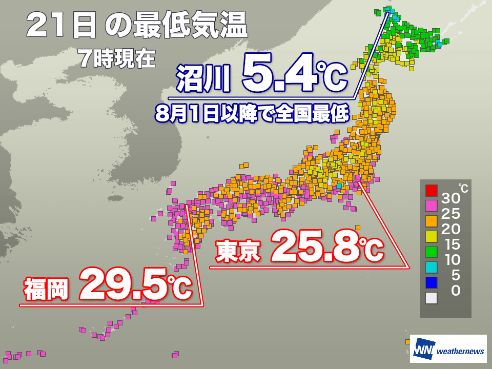 一方で、九州の福岡市では暖かい空気に覆われ、南寄りの風が吹いて気温が下がらず、最低気温は29.5℃と30℃近いものとなりました。今朝は日本列島の南北で気温差がかなり大きくなっています。