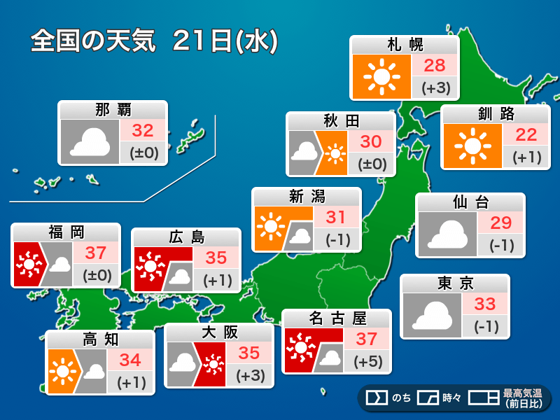 午後はさらに気温が上昇し、35℃以上の猛暑日の所がさらに増える見通しです。西日本、東海は厳しい暑さとなり、熱中症対策が欠かせません。