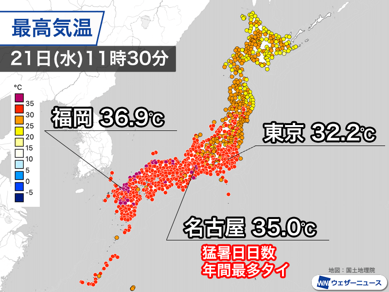 11時30分までの最高気温が全国で最も高いのは鳥取県米子市で37.0℃を観測。福岡市は36.9℃、兵庫県豊岡市は35.6℃まで上がっています。名古屋市は35.0℃と、これで今年36日目の猛暑日になり2018年の年間最多記録に並びました。また、福岡県太宰府市は今日も35℃に到達し、連続猛暑日は34日に伸びています。