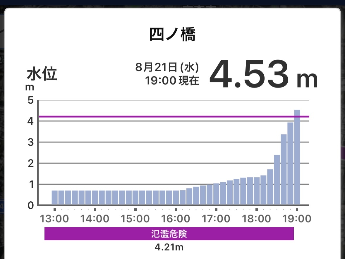 都市部の河川は短時間の雨でも急速に水位が上昇します。水の流れが速くなり、周辺では浸水のおそれがあるため、様子が気になっても川には近づかないでください。