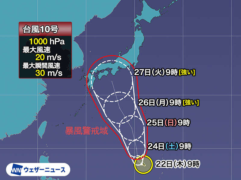 勢力の予想を見ると、台風10号は24日(土)頃には暴風域を伴う程度に発達し、4日先には「強い」台風になる可能性があります。