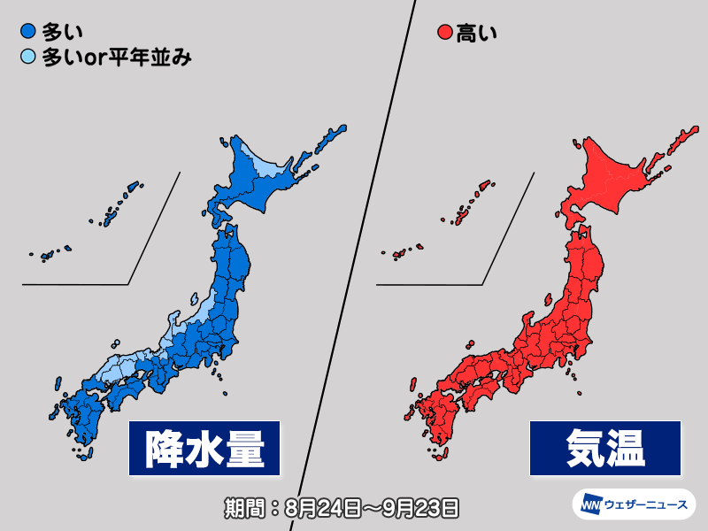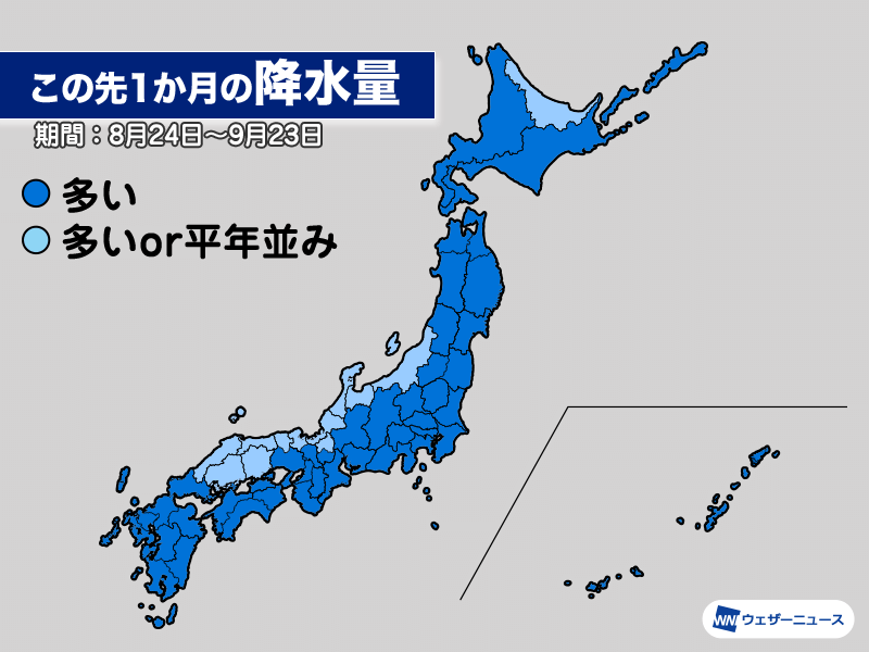 南からの暖かく湿った空気や、熱帯低気圧の影響を受けやすい見込みです。このため、降水量は全国的に平年より多い傾向となる予想です。