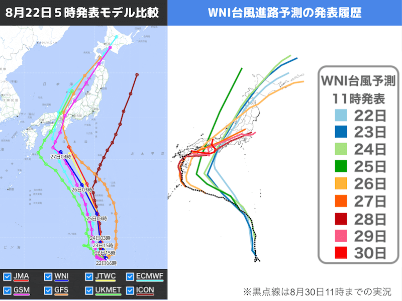 台風10号は、22日(木)3時、マリアナ諸島で熱帯低気圧から台風へと発達しました。上図左は、初回発表となった22日5時の台風進路予測(モデル比較)画面のキャプチャです。この時点では、WNI予測をはじめ、世界の多くの予測モデルが近畿方面への上陸を見込んでいました。