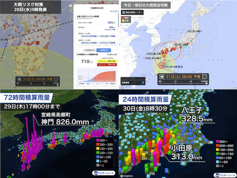 ウェザーニュースfor businessでご提供中の「大雨リスク対策(今日明日の大雨閉店判断)」では、28日(水)9時の予測で、九州南部や四国、三重、静岡方面に、赤色の「警戒」レベルを発表していました(図上段右)。72時間先までの積算雨量予測が、浸水などの被害を及ぼすレベルである300ミリ以上を予測している場合、警戒の判定をしているものです。九州南部では広範囲で100年に1度レベルの500ミリ以上の雨量を予測、山間部の宮崎県児湯郡西米良村では710ミリを予測していました(図:上段左)。