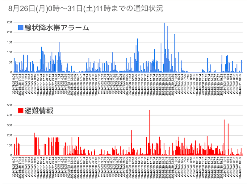 26日から31日までの通知状況のグラフを見ると、台風によってもたらされた湿った空気の影響で、週はじめから線状降水帯が発生し、どちらのアラームも多数送信されていたことがわかります。特に線状降水帯アラームは、気象庁の解析よりも多くの事象を検知していました。