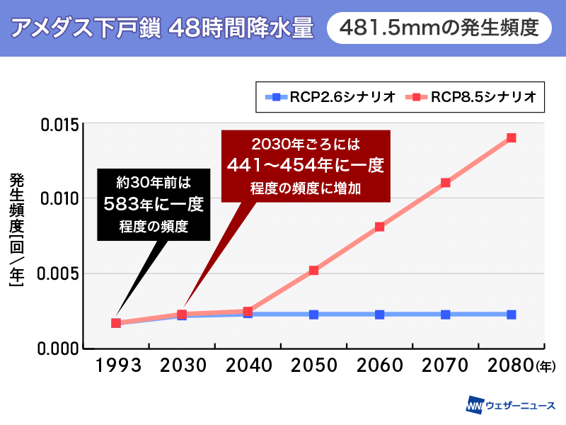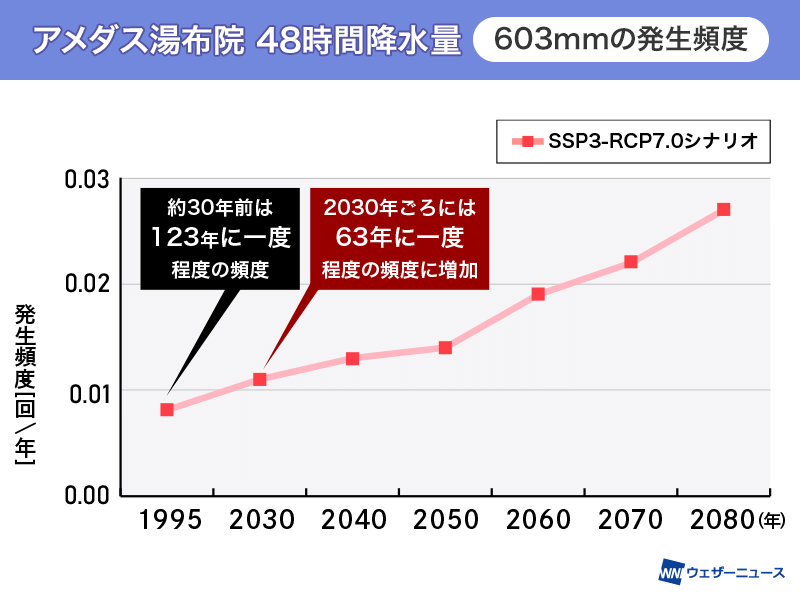大分の大雨の起こりやすさ 2倍に変化していた