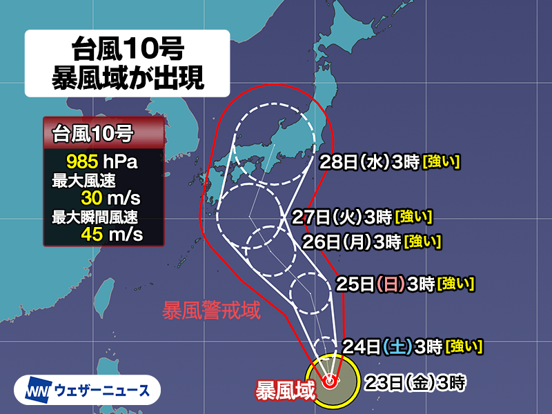 台風10号はさらに発達を続け、明日24日(土)には「強い」台風になる予想となっています。来週にかけてもその勢力を維持したまま北上する見込みです。