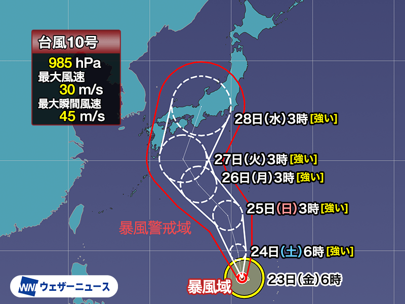 台風10号はさらに発達を続け、明日24日(土)には「強い」台風になる予想となっています。来週にかけてもその勢力を維持したまま北上する見込みです。