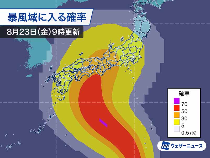 同様に、気象庁の発表した暴風域に入る可能性をみると、5日先までに暴風域に入る可能性が近畿地方などで50%前後となっていて、期間が近づけばさらに確率は高まる所がある見込みです。