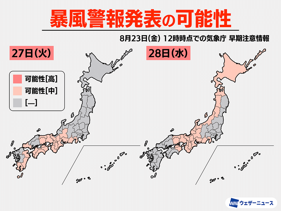 現時点での気象庁の早期注意情報を参照すると、27日(火)には東海〜九州の各地で暴風警報の可能性が[中]、28日(水)には四国〜北海道の各地で暴風警報の可能性が[中]となっています。現時点では可能性が[高]のところはありませんが、日が近づいてくると可能性が高まることも考えられます。