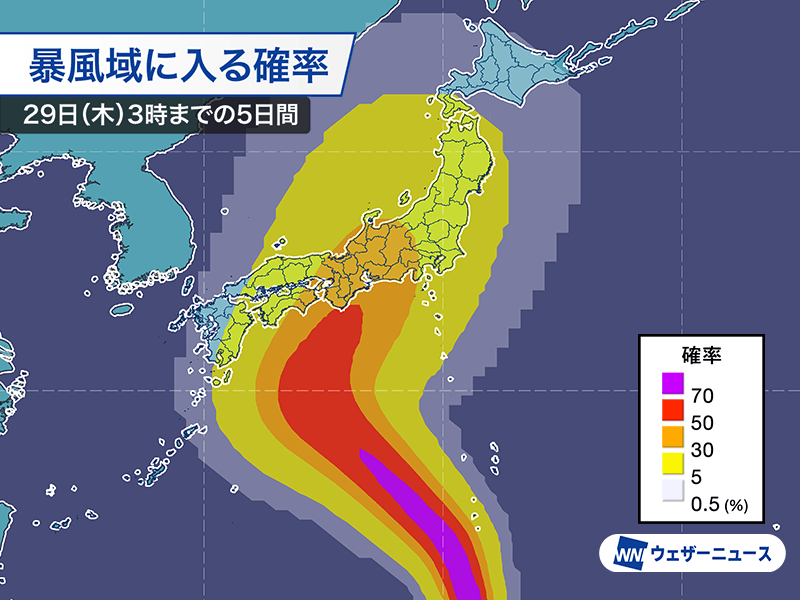 進路に近い地域では大雨に加えて暴風の影響が大きくなることが懸念されます。進路の東側に離れた地域でも風が強まり荒天となるおそれがあるため注意が必要です。