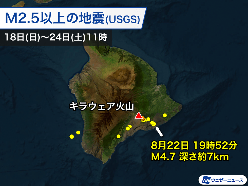 また、トロピカル・ストームの接近に加え、ハワイ島では20日(火)頃から地震が増加しています。22日(木)にはマグニチュード4.7のやや強い地震も発生しました。