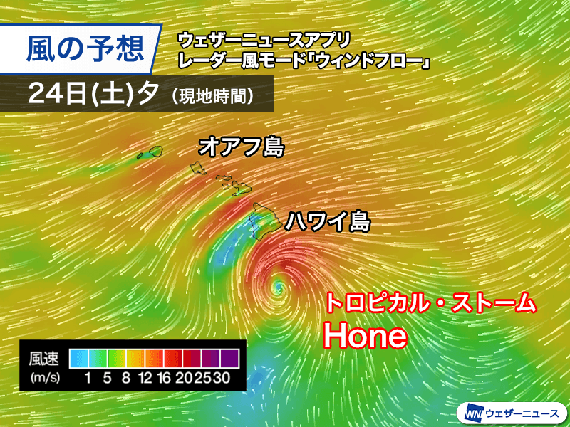 太平洋を進んでいた熱帯低気圧が勢力を強め、トロピカル・ストームHone(ホネ)となりました。今後も西寄りに進んで、現地時間の24日(土)夕方から夜にかけてハワイの南の海上を通過する見込みです。