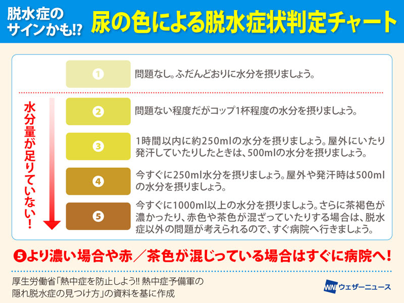厚生労働省では『尿の色による脱水症状判定チャート』を発表しています。