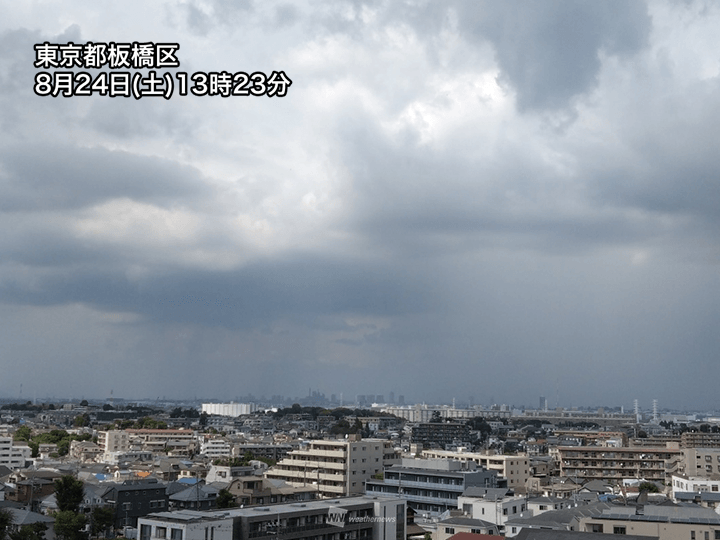 湿った空気を運び込んでいる南風の強さが変化している東京都と埼玉県の都県境や、関東西部・北部の山沿いで特に雨雲が活発です。東京都板橋区では北〜北西方向に積乱雲から雨が降っている様子が確認できます。