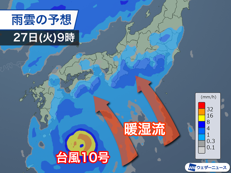 台風の中心が南に離れている段階から、南東の湿った風によって西日本、東日本の太平洋側では局地的に雨が強まる見込みです。27日(火)頃は台風が進路を変えるタイミングで動きが遅くなるため、同じような所で断続的に強い雨が降るとみられます。
