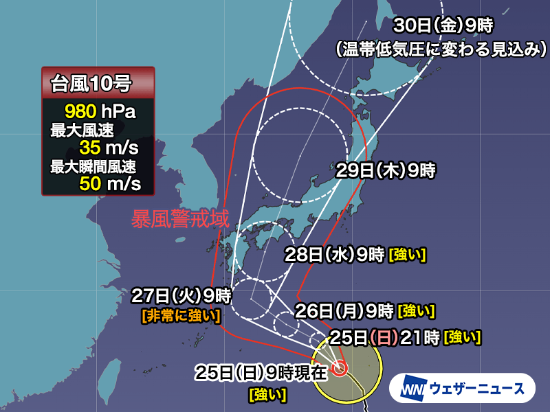進路に近い地域では暴風や大雨の影響が大きくなることが懸念されます。また、進路の東側では中心から離れた地域でも風が強まり荒天となるおそれがあるため注意が必要です。