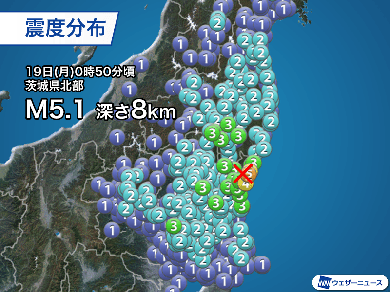 19日(月)0時50分頃、茨城県北部を震源とするマグニチュード5.1、深さ8kmと推定される地震が発生しました。この地震で茨城県日立市で最大震度5弱、高萩市で震度4、常陸太田市、北茨城市、笠間市、ひたちなか市、福島県白河市、古殿町、栃木県芳賀町、埼玉県加須市などで震度3を観測しています。