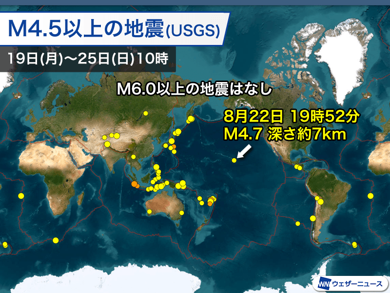 アメリカ地質調査所の解析によるマグニチュード6以上の地震は発生していません。最も大きな地震はフィリピンで発生したマグニチュード5.7です。