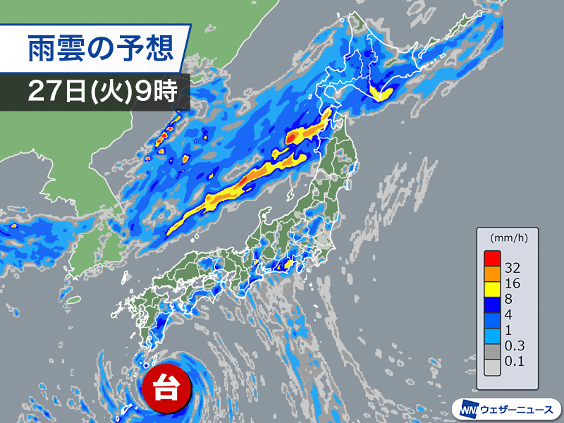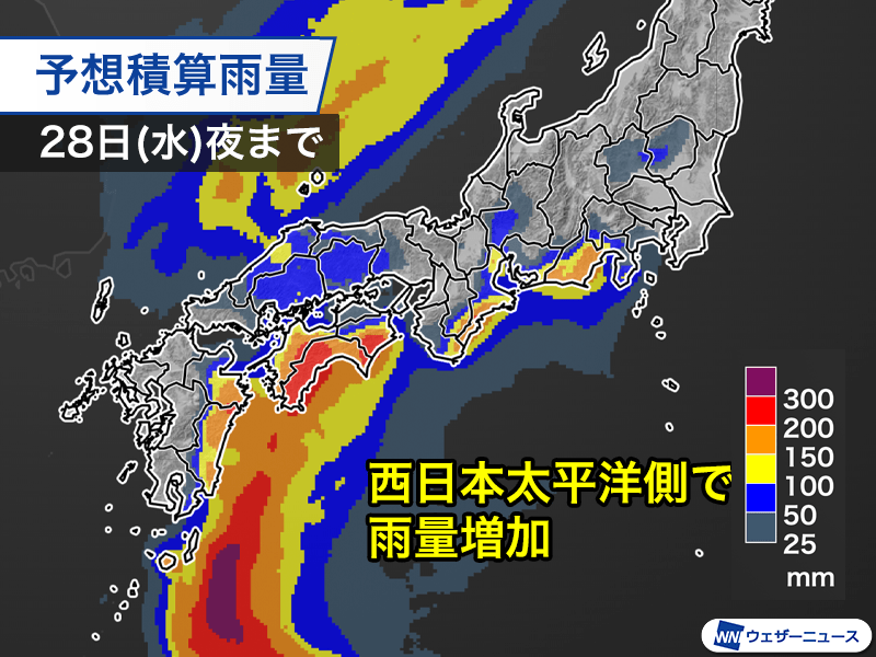 台風の中心が南に離れている段階から、南東の湿った風によって西日本、東日本の太平洋側では局地的に雨が強まる見込みです。27日(火)頃は台風が進路を変えるタイミングで動きが遅くなるため、同じような所で断続的に強い雨が降るとみられます。