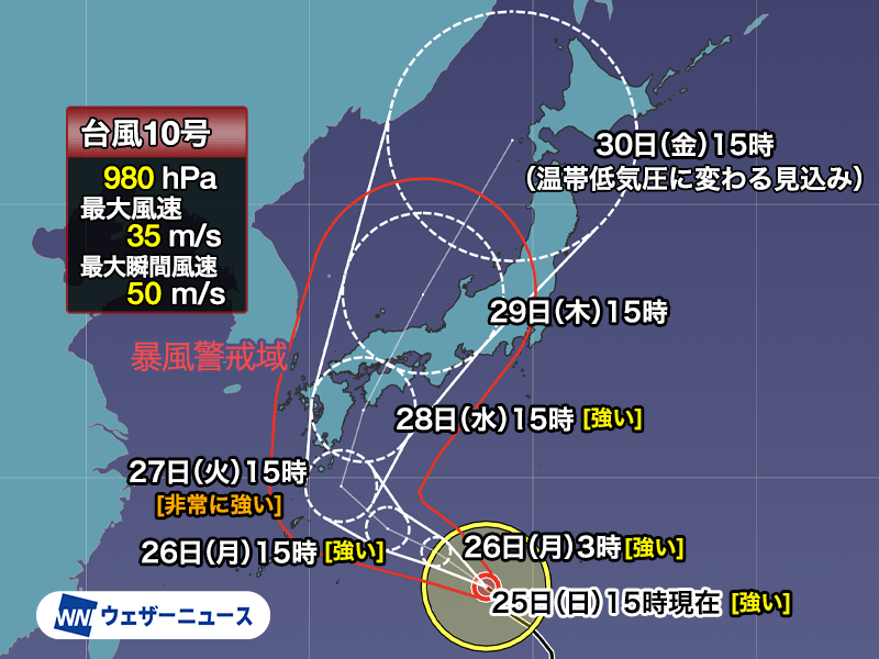 今日は周辺の風の環境が悪く、台風の勢力はほぼ変わりませんでした。明日26日(月)以降は環境が改善して急速に発達し、27日(火)には中心付近の最大風速が45m/sに達して、非常に強い勢力になるとみられます。