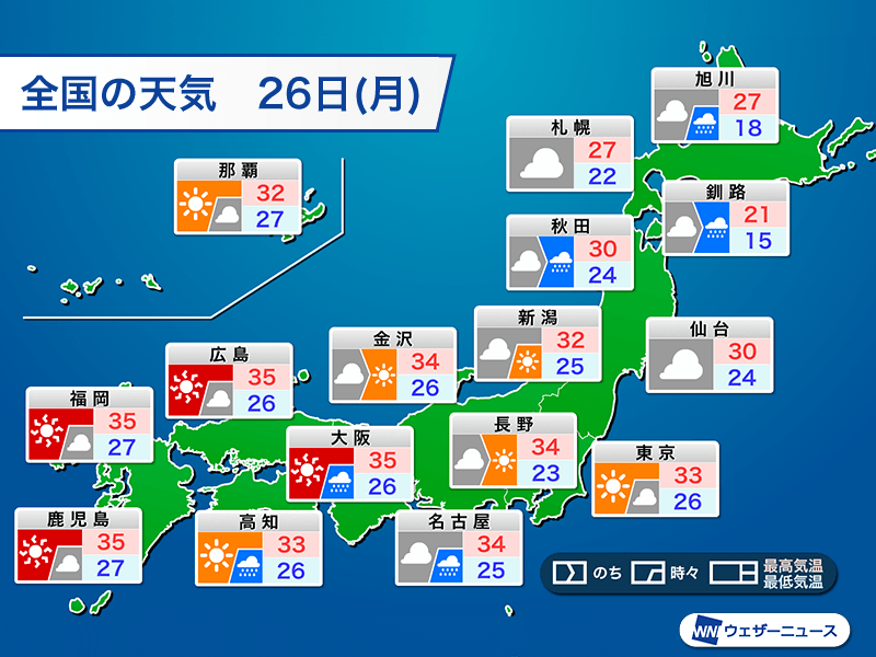 明日26日(月)は日本海の前線帯が今日よりも北上し、西日本、東日本では晴れるエリアが拡大します。上空は今日と同じような暖かな空気に覆われるため、日差しが増えると、その分だけ暑さが増す見込みです。