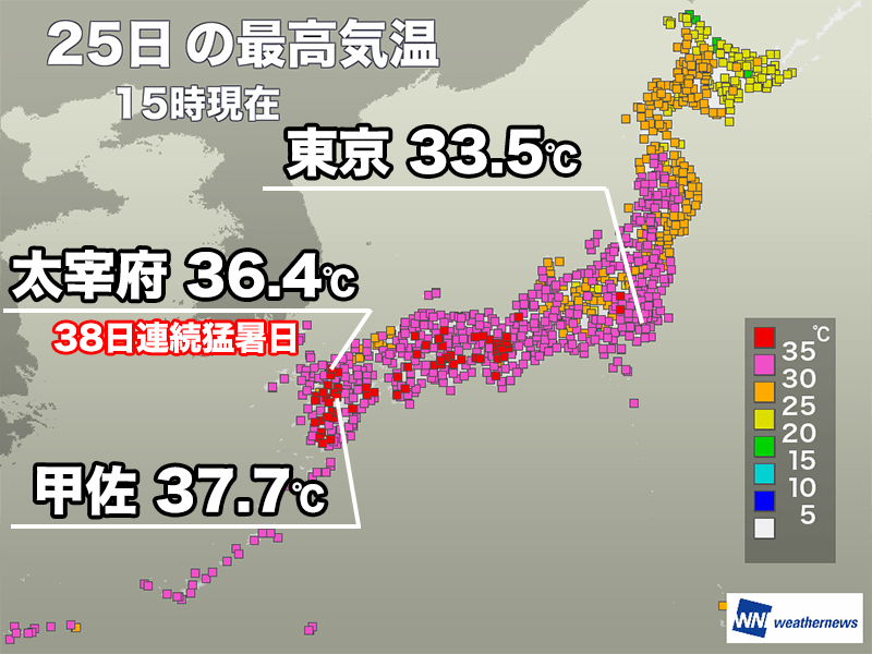 福岡県太宰府市は昼頃まで晴れて予想以上に気温が上昇し、36.4℃と連続猛暑日は38日に伸びています。ただ、午後になって雨が降り暑さは少し落ち着きました。15時までの全国最高は熊本県甲佐町で37.7℃を観測。大阪市も35.9℃と猛暑日です。