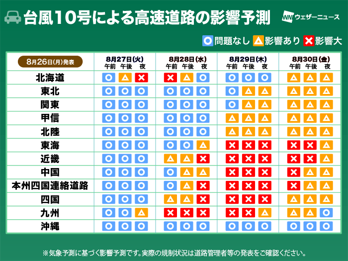 台風10号の接近・上陸に伴い、九州では27日(火)遅くから影響が出始めることが考えられます。西日本を中心に大雨や暴風が予想され、広範囲で通行止めが発生する可能性があります。 東海も29日(木)以降は大雨と強い風により、通行止めとなる路線がある見込みです。