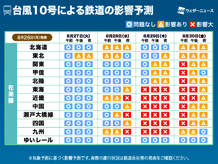 また、北日本では明日27日(火)〜28日(水)は前線による大雨のリスクがあり、30日(金)以降は台風の進路によっては広範囲で遅延や一部運休が発生する可能性があります。