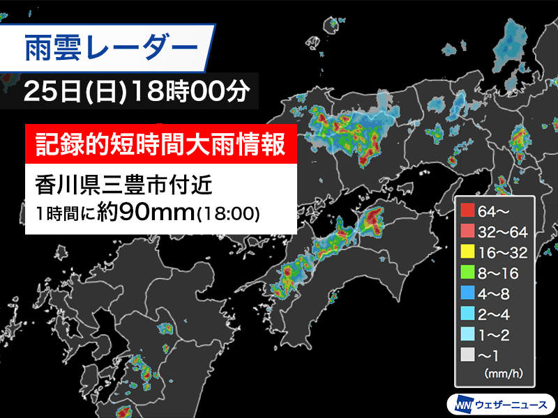 香川県で1時間に約90mmの猛烈な雨 記録的短時間大雨情報
