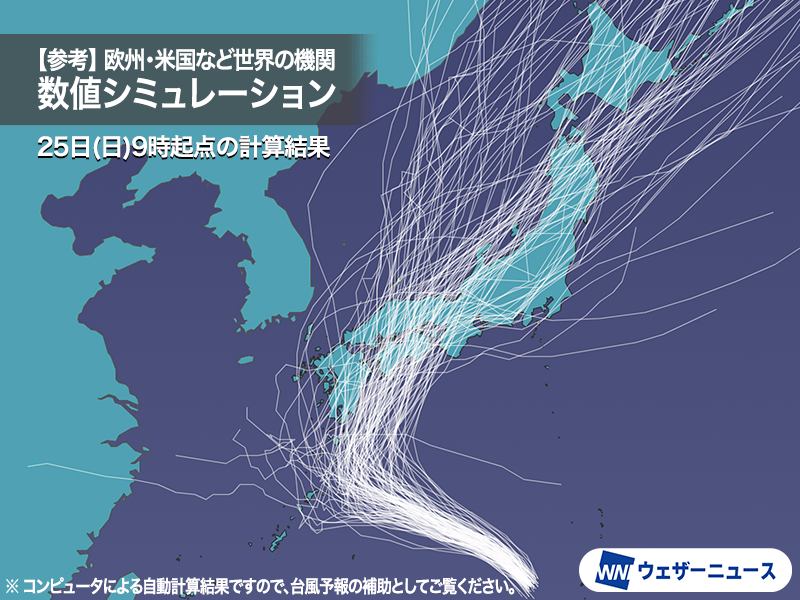 これらを比較すると、転向して西日本方面へ向かう傾向は概ね揃っているものの、上陸する地域は九州〜紀伊半島付近まで考えられる状況です。わずかな進路の違いでも影響が出る地域や影響の程度に大きな差がでてきますので、予報の変化に注視が必要です。日がたつにつれて誤差は縮小する見込みですので、今後の情報にご注意ください。