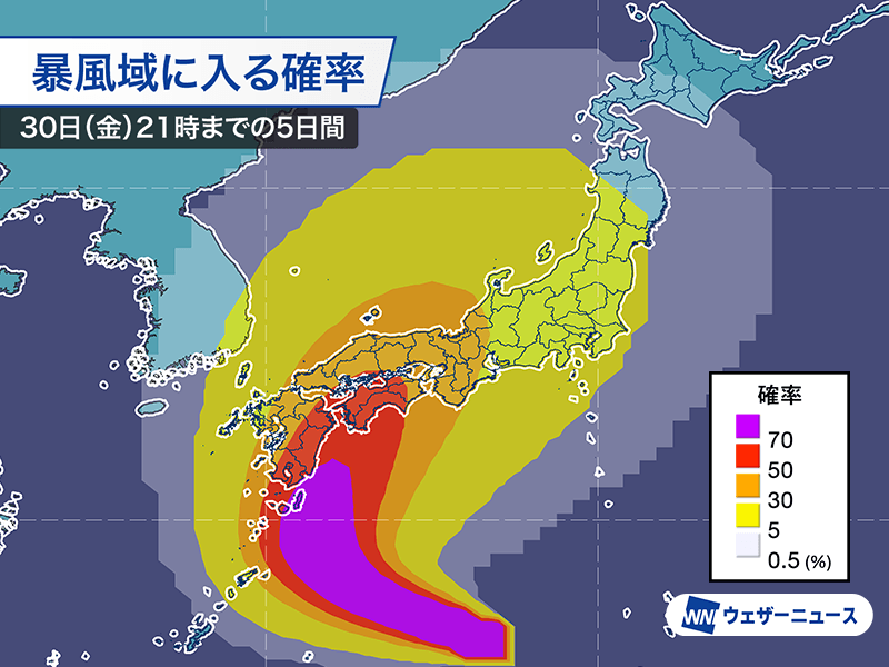 5日先までに台風の暴風域に入る確率がが50%以上の府県予報区は以下の通りです。(気象庁)