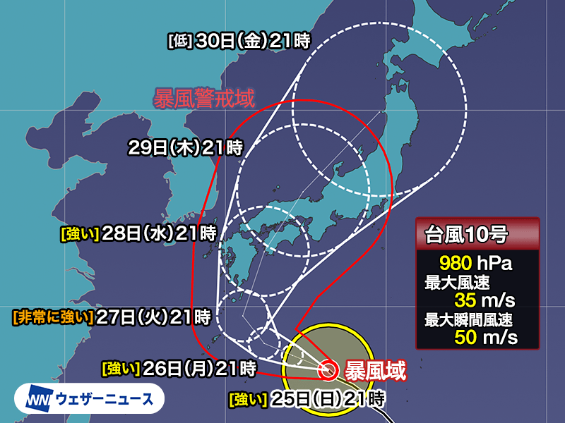 昨日から台風10号は乾燥した空気の影響で発達できずにいますが、この先は再び発達し始め、最盛期には「非常に強い」台風になる予想です。日本への上陸前には「強い」台風に戻る見通しですが、油断はできません。