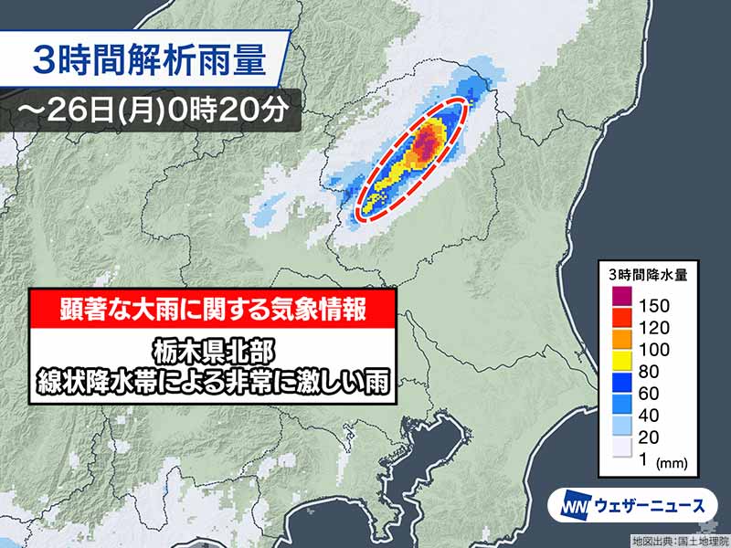 栃木県北部付近では非常に激しい雨が降り続き、3時間に200mm近い雨が降ったとみられ、土砂災害や河川の氾濫が発生するおそれが急激に高まっています。