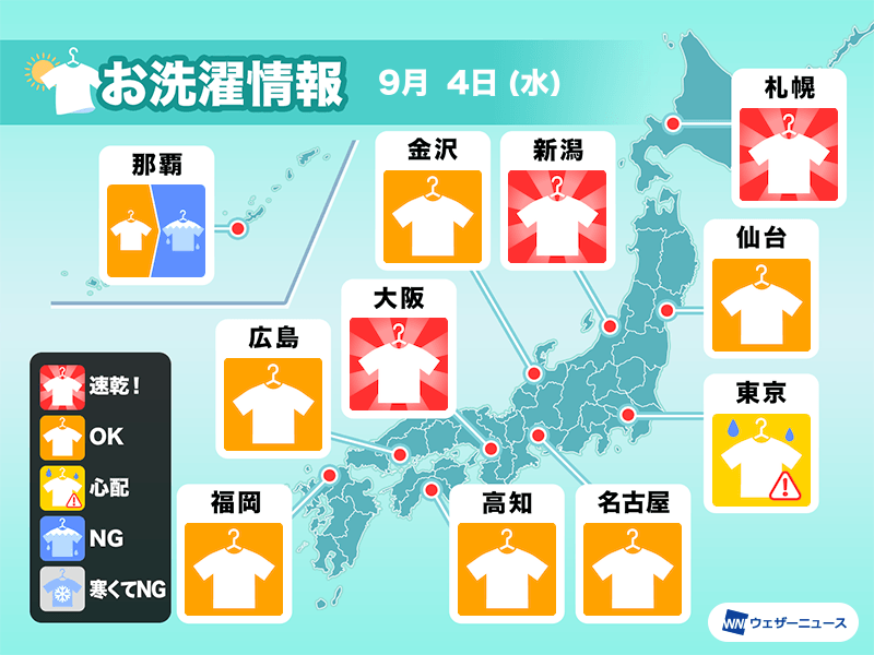 北海道や東北北部は青空が広がり外干し日和です。特に速乾エリアではシーツやタオルケットなどの大きな物や、ジーンズやマットなど厚手の物もよく乾きます。